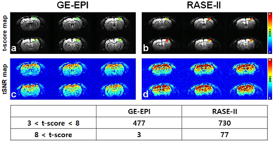 t-score and tSNR maps for GE-EPI (a, c) and RASE-II (b, d) on the somatosensory area of in-vivo rat brain. The top row shows t-score maps of BOLD activation in the range between 3 and 8 (a, b). The second row shows tSNR maps for the baseline volumes in the range between 0 and 40 (c, d). The table in the bottom row summarizes the number of activated voxels with t-scores in the range between 3 and 8, above 8. The maximum t-score of GE-EPI and RASE-II was 9.05 and 11.65, respectively.
